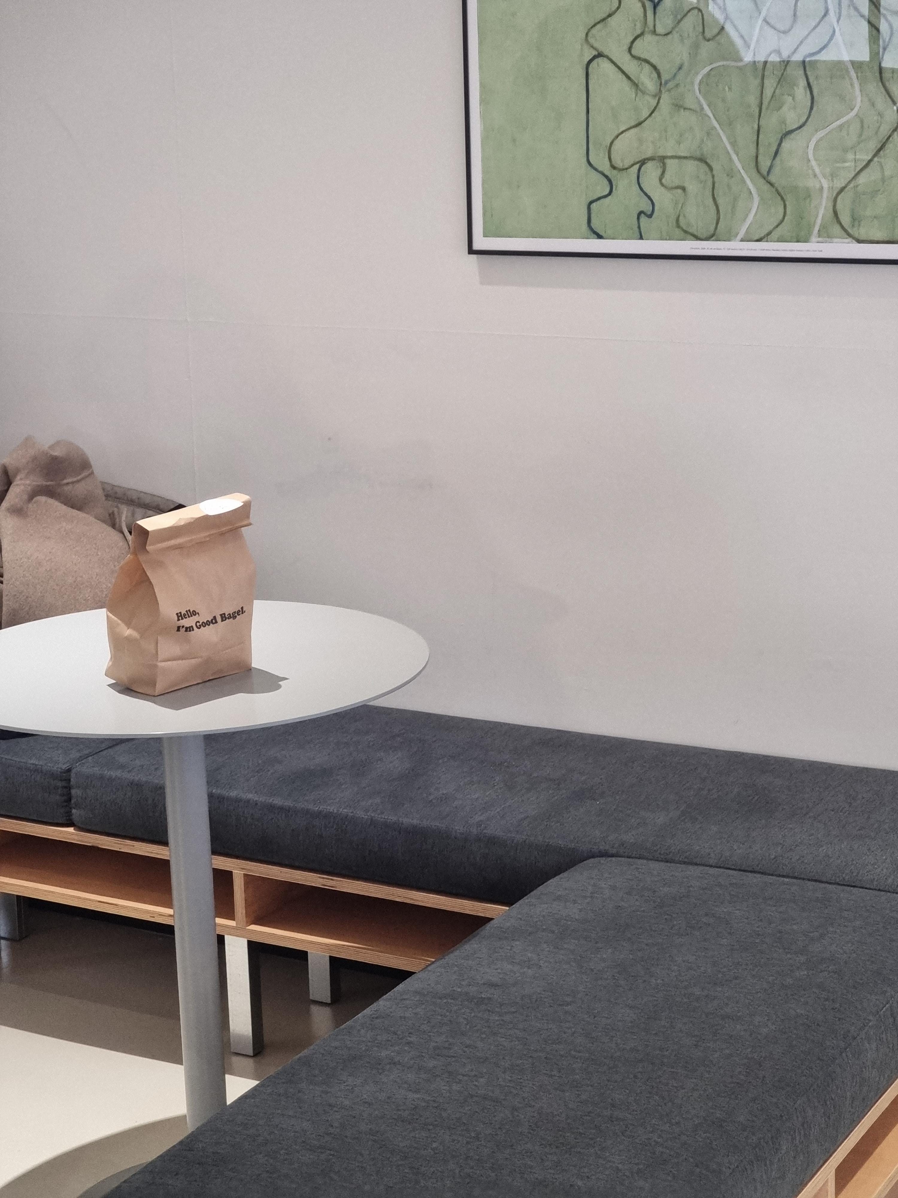 포장하니 종이 봉투에 담아주시고 카페 이용하려면 굿베이글 나가셔서 오른쪽으로 아주 조금 걸어가면 카페가 있습니다.