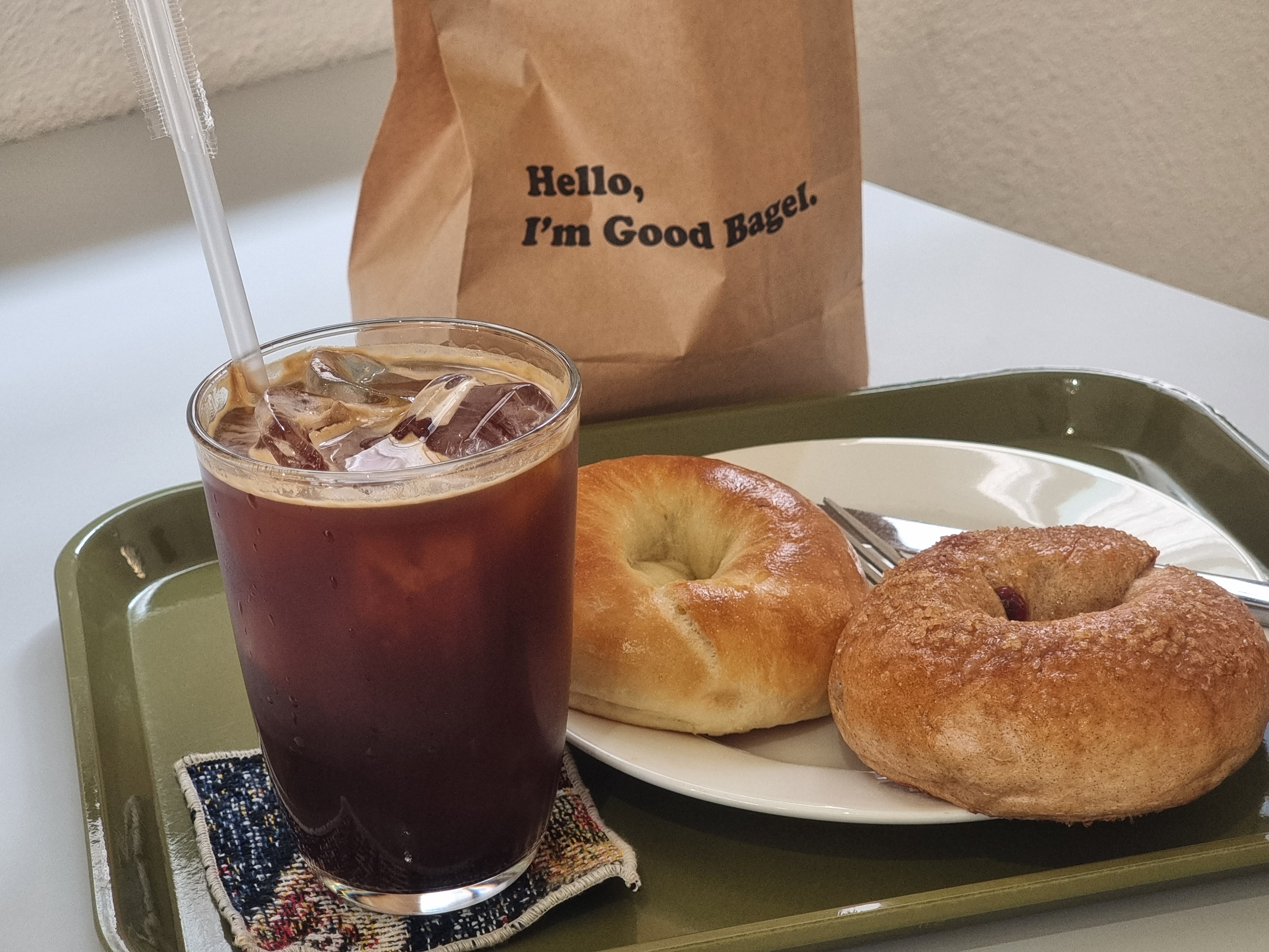 커피를 주문하러 갔는데 굿베이글 봉투를 들고 있으니까 베이글 접시도 같이 제공해줄지 여부를 확인하셨습니다.